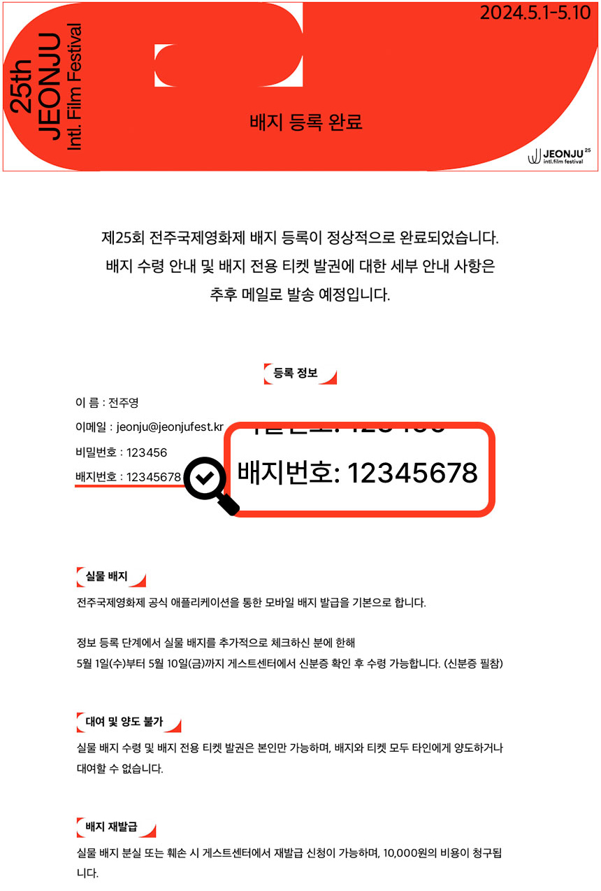 배지 번호는 등록 완료 메일에서 확인할 수 있습니다.